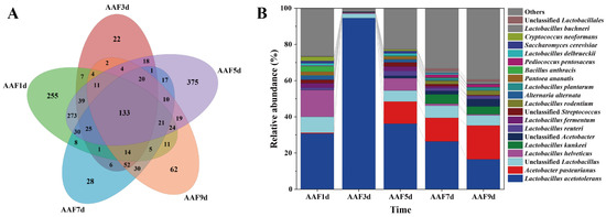 Microbial succession during the acetic acid fermentation (AAF) of Shanxi aged vinegar (SAV). (A): Microbial diversity during AAF in SAV; (B): changes in microbial abundance during AAF in SAV.