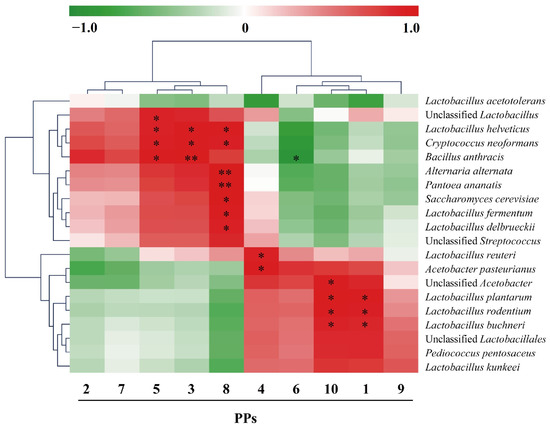 Spearman correlation analysis heat map between polyphenols (PPs) and microorganisms during the acetic acid fermentation (AAF) of Shanxi aged vinegar (SAV). Red and green indicate positive and negative correlations, respectively, and the shade suggests the size of the correlation coefficient; * p < 0.05; ** p < 0.01. Please refer to Section 3.1.1. for the PPs associated with each PP number.