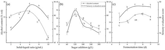 The results of the single-factor test. Note that the error line represents the standard deviation, with different lowercase letters indicating significant differences in the sensory evaluation (p < 0.05) and different uppercase letters indicating significant differences in the alcohol content (p < 0.05). (a) The effects on sensory scores and the alcohol content. (b) The changes in sensory scores and the alcohol content during the fermentation process. (c) The effect of the fermentation time on the sensory scores and alcohol content.