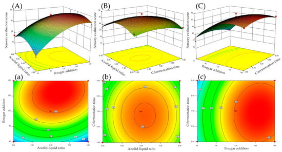 Response surface and contour plots for the sensory score. (A,a) Effect of the solid–liquid ratio and sugar addition. (B,b) Effect of the solid–liquid ratio and fermentation time. (C,c) Effect of the sugar addition and fermentation time.