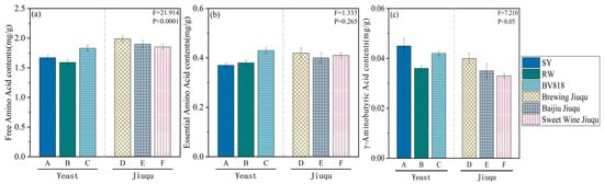 The effect of different starters on the free amino acid content in ginkgo wine. (a) The free amino acid content. (b) The essential amino acid content. (c) The γ-aminobutyric acid content. (values represent the mean ± SD. A is RW; B is SY; C is BV818; D is Brewing Jiuqu; E is Baijiu Jiuqu; and F is Sweet Wine Jiuqu.).