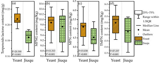Contents of metabolites in ginkgo wine between the yeast and Jiuqu groups. (a) The terpenoid lactone content. (b) The MPNG content. (c) The MPNG content. (d) The TMPN content.