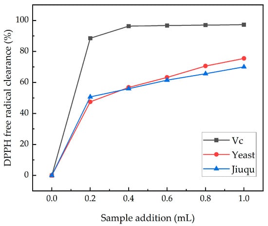 The effect of ginkgo wine on the antioxidant capacity is shown in Figure 5. As the sample size increases, the scavenging ability of DPPH free radicals gradually increases. When the addition amount of the two groups of samples was 0.2 mL, the clearance rate of the DPPH free radicals rapidly increased to nearly 45%, and at this time, the clearance rate of the Jiuqu group was higher than that of the yeast group. After 0.4 mL, the clearance rate of both groups of samples slowed down, and the clearance rate of the yeast group was higher than that of the Jiuqu group. Finally, when the addition amount was 1.0 mL, the DPPH free radical clearance rates of the yeast group and the Jiuqu group reached the maximum values within the experimental range, which were 75.48% and 70.05%, respectively. The results showed that the scavenging effects of the two types of fermentation starter on the DPPH free radicals were similar. Through fermentation, the DPPH free radical clearance rate of the yeast group samples was generally higher than that of the yeast group samples, which may be related to the more active components of ginkgo wine after yeast fermentation []. However, overall, compared to other fruit and fruit wines, ginkgo wine has a weaker antioxidant capacity [].