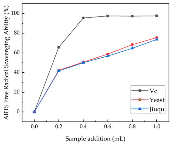 The scavenging ability of ABTS+ cation radicals is shown in Figure 6. The clearance rates of the two samples gradually increased with increased sample addition, and rapidly increased at 0.2 mL. After 0.2 mL, the clearance rates of the ABTS+ cationic free radicals in the two groups of samples steadily increased. At 1 mL, the clearance rates of the yeast group and the Jiuqu group were 75.49% and 73.68%, respectively. The results indicate that the yeast group sample has a greater ability to scavenge free radicals and reduce oxidative stress. The ABTS+ clearance rate of the yeast group sample was slightly higher than that of the Jiuqu group, indicating that yeast fermentation produces more active ingredients in ginkgo wine, which has substances that enhance the antioxidant capacity [].
