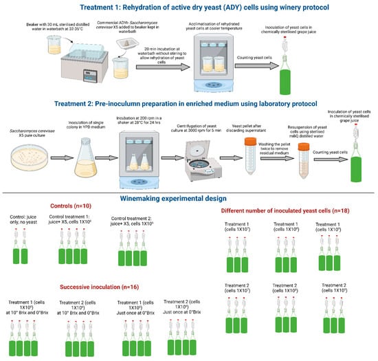Saccharomyces cerevisiae X5 (Laffort, Bordeaux, France) was used for the inoculation of the microferments. Two different inoculation protocols were used in this study as described below and shown in Figure 1.