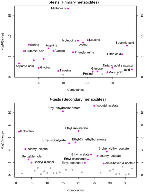 Primary and secondary metabolites that were significantly different between two inoculation methods used in the study. Pink dots with names indicate the metabolites that were statistically significant (p < 0.05) between two inoculation methods, while grey dots indicate insignificant metabolites (p > 0.05).