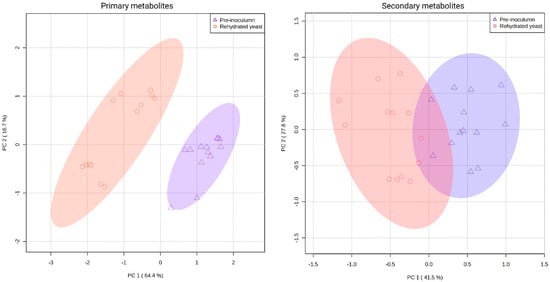 Two-dimensional projection of principal component analysis score plots based on primary and secondary metabolites showing the differences in the Sauvignon blanc wine composition produced by commercial Saccharomyces cerevisiae X5 strain using two different inoculation methods: pre-inoculum in rich medium and rehydrated active dry yeasts.