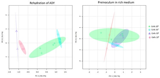 Two-dimensional projection of principal component analysis (PCA) score plots based on primary and secondary metabolites, showing the effect of inoculated cell concentrations during Sauvignon blanc fermentation by commercial Saccharomyces cerevisiae X5. ADY, active dry yeasts.