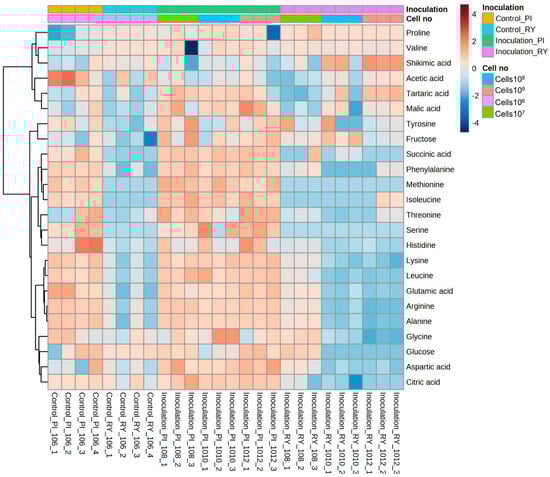 Heatmaps showing the concentrations of primary metabolites in different Sauvignon blanc wines produced by using commercial Saccharomyces cerevisiae X5. Two different inoculation methods were used: pre-inoculum prepared in rich media (noted as PI), and rehydrated active dry yeasts (noted as RY). Inoculated cell concentrations (cells/mL) are also shown as: Cells 106 (control wines); Cells 107; Cells 108; Cells 109.