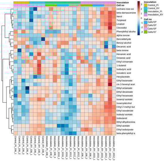 Heatmaps showing the concentrations of secondary metabolites in different Sauvignon blanc wines produced by using commercial Saccharomyces cerevisiae X5. Two different inoculation methods were used: pre-inoculum prepared in rich media (noted as PI), and rehydrated active dry yeasts (noted as RY)). Inoculated cell concentrations (cells/mL) are also shown as: Cells 106 (control wines); Cells 107; Cells 108; Cells 109.