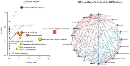 Two metabolic pathways, aspartate and glutamate metabolism and cysteine methionine metabolism, particularly stood out compared with other pathways when their impact (shown in the x-axis in Figure 7a) and significance (shown in the y-axis in Figure 7a) were taken into account. Both pathways were upregulated for PI, which could be traced back to the presence of relatively higher concentrations of amino acids (nitrogen compounds) and varietal thiols (sulphur-containing compounds) in the wines produced using PI. On the other hand, the metabolic pathway related to aromatic amino acids (phenylalanine, tyrosine, and tryptophan biosynthesis) was slightly upregulated for RY, even though the concentration of most of these amino acids was comparatively lower in RY wines than PI. However, levels of esters, medium-chain fatty acids, and higher alcohols were higher in RY wines, indicating these amino acids were catabolized and aided in the production of these aroma compounds []. We also performed DSPC network analysis to determine the relationship between the metabolites analysed in the wines. There were 3 subnetworks: subnetwork 1 with 21 different notes (Figure 7b), subnetwork 2 with 5 nodes, and subnetwork 3 with 3 nodes. Subnetwork 1 provided the comprehensive picture that supported our observation from the pathway analysis, as we could see the positive correlation (red lines) among most of the primary metabolites and negative correlation of primary metabolites with the major aroma compounds (blue lines). This again confirmed that most of the primary metabolites were consumed by the wine yeasts during the fermentation that ultimately resulted in the production of the associated aroma compounds, including esters and higher alcohols (Figure 7b).