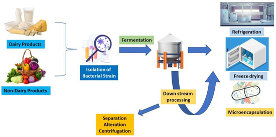 Generally, probiotics play a crucial role in the development of the human body, including digestive systems, mental disorders, immunological disorders, and so on. They can be found in many dairy and non-dairy products and are considered to have several health advantages. Kefir and yoghurt are two dairy products that are widely recognized for their probiotic properties [26,27]. Probiotics are formulated by fermenting milk with certain bacterial strains such as Lactobacillaceae and Bifidobacterium. Lactose, a natural milk sugar, undergoes fermentation and is transformed into lactic acid. This trims down the product’s pH and creates the acidic environment required for the enhancement of valuable microorganisms. Dairy probiotics are made by several processes (Figure 2) [28]. To get rid of dangerous microorganisms, milk is first pasteurized. The milk is then infused with the specific strains of microbes, and then, the milk is kept at a particular temperature to encourage bacterial development. The bacteria break down the lactose in the milk during fermentation to generate lactic acid, which gives the final product its distinctively sour flavour [29]. Non-dairy probiotic supplements are a great alternative for people who are intolerant to lactose or consume a plant-based diet. Probiotics that are non-dairy can be made from coconut, soy, and almond milk, among other sources. Dairy probiotics are produced using identical fundamental principles, but certain alterations are needed to account for the distinctive properties of non-dairy components. One common method of producing non-dairy probiotics is using starter cultures. Using starter cultures is one popular technique for creating non-dairy probiotics. Starter cultures are combinations of certain bacterial strains that are introduced to non-dairy products. These cultures have been chosen because of their propensity to successfully ferment milk and generate favourable microbial strains. The gratification and nutritional accessibility of non-dairy products replacements might vary, as the fermentation process for non-dairy products may take longer than for dairy products [30,31].