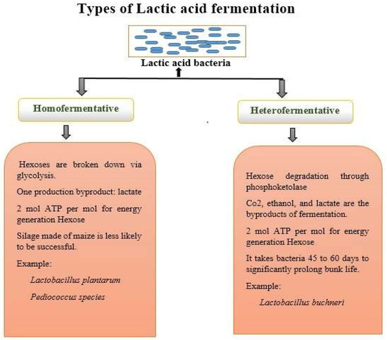 By modifying environmental factors like pH, glucose content, and resource constraint, one can modify the homofermentative state of Lactococcus [89]. To make cheese, thermophilic strains of Lactobacillaceae helveticus are also employed. Streptococcus salivarius, Lactobacillaceae acidophilus, and Lactobacillaceae delbruckii are some of the homofermentative bacteria utilised in the yoghurt business. Other homofermentative bacteria employed in the milk industry include Streptococcus spp., Enterococcus, Pediococcus, and Aerococcus, albeit they are rarely utilized as starter cultures. The detection of CO2 gas is a requirement for heterofermentative bacterial testing. They are infrequently employed as starter cultures in the dairy business despite being uncommon in the milk and dairy industries [93]. Heterofermentative bacteria can occasionally result in flaws like slits in hard cheeses and bulging packaging in other dairy products if they enable development in considerable quantities. Leuconostoc spp., Lactobacillaceae brevis, Lactobacillaceae fermentum, Lactobacillaceae reuteri, Lactobacillaceae plantarium, Lactobacillaceae casei, and Lactobacillaceae curvatus are a few examples of heterofermentative bacteria. LAB that creates ethanol/acetic acid and CO2 instead of lactic acid as by-products of the fermentation of glucose are known as heterofermentative bacteria. The main distinction between homofermentative and heterofermentative bacteria is already mentioned in Figure 3 [94]. The dairy industry frequently uses starter cultures for homofermentative bacteria. On the contrary, the dairy sector employs starter cultures of heterofermentative bacteria occasionally. As the by-product of hexose metabolism during glycolysis, homofermentation almost exclusively yields lactic acid. In contrast, the phosphoketolase route is used in heterofermentative process to produce equimolar levels of lactic acid, carbon dioxide, ethanol, and acetate from hexose. Facultative heterofermenters adopt this route. In facultative heterofermentative Lactobacillaceae, hexoses are essentially converted to lactic acid by the Embden–Meyerhof–Parnas (EMP) route. While Lactobacillaceae acidophilus is categorized as an obligatory homofermentative member of the Lactobacillaceae, where over 85% of hexoses are fermented to lactic acid by the glycolysis pathway, Lactobacillus casei, Lactobacillaceae rhamnosus, Lactobacillaceae paracasei, and Lactobacillaceae plantarium are defined as facultative heterofermenters [95].