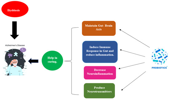 Probiotics have demonstrated potential for an assortment of medical conditions, such as the management of infant colic, the prevention of necrotizing enterocolitis and sepsis in premature infants, the treatment of periodontal disease, and the induction or maintenance of remission in ulcerative colitis [9]. An unbalanced microbiota in the gut that causes the alteration of the microbiome (dysbiosis) has been strongly associated with psychological disorders. The gut produces several neurotransmitters that are linked to anxiety and depression symptoms, including the neurotransmitters glutamate, serotonin, and GABA (gamma-aminobutyric acid). Numerous mental diseases are believed to be associated with gut dysbiosis, and there is strong evidence linking gut health with psychological wellness. One of the main characteristics and pathological traits linked to a wide range of neurodegenerative illnesses, including Alzheimer’s, Parkinson’s, and Huntington’s diseases, is neuroinflammation such as microgliosis and astrogliosis. Furthermore, owing to the constant presence of inflammation in the brain, classic neuroinflammatory illnesses like multiple sclerosis clearly highlight the significance of neuroinflammation in these neurodegenerative diseases. The most prevalent dementia amongst them is AD, which may be identified by an increase in neurofibrillary plaque build-up in the brain. There is strong evidence that GM (gastrointestinal microbiota) plays a role in the pathogenesis of AD, which is largely mediated by altered microglial activity in the brain. AD is just one neurodegenerative condition where microglial dysfunction has been identified [10].
