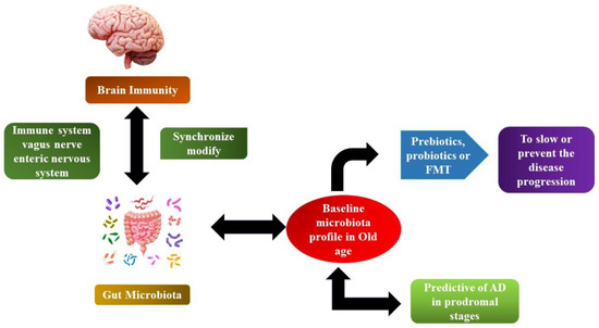 The “gut–microbiota–brain axis” is a term coined for representing such relationship: a link uniting the gut microbiome and AD and also representing the role played by inflammation in the progression as well as onset of AD. The considerably discussed topic of the microbiota–gut-brain axis holds that the gut microbiota has an impact on the activities of central nervous system (CNS) [11,12,13]. By encouraging the development of advantageous microbes, a diet high in prebiotics supports the health of the digestive system. Throughout the fermentation of prebiotics, short-chain fatty acids (SCFAs) including butyrate, acetate, and propionate are created. They are crucial for maintaining metabolic and intestinal health. Likewise, according to the study, probiotics affect brain function and behaviour, and knowledge of these biological causes may help to improve psychological well-being in both healthy people and, possibly, those with mental illnesses [11]. Probiotics have been shown to enhance stress response, improve memory function, and even lessen anxiety and sadness in preclinical experiments with rodents [14,15].