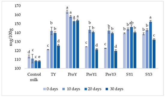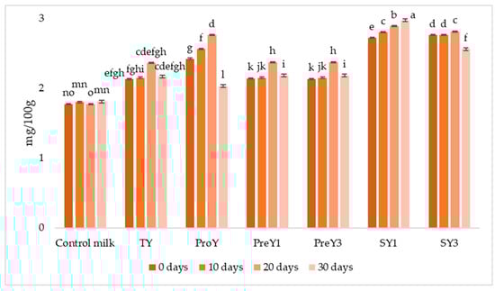 Butyric acid content (mg/100 g) in control milk and yoghurt samples. a–o Different letters on bars indicate statistically significant differences (p-value < 0.05).