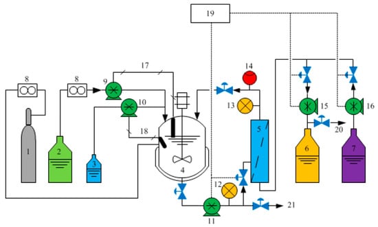 Schematic diagram of the membrane integrated continuous fermentation system. (1) N2 storage tank; (2) feed medium storage tank; (3) neutralizer reservoir; (4) fermenter; (5) hollow-fiber microfiltration module; (6) product storage tank; (7) cleaning solution tank; (8) flow meter; (9) medium feed control pump; (10) alkali feed control pump; (11) recirculation pump; (12) feed pressure indicator; (13) retentate pressure indicator; (14) retentate flow rate indicator; (15) permeate control pump; (16) backwash pump; (17) level sensor; (18) pH sensor; (19) control host; (20) sampling (analysis of residual sugars and D-lactic acid); (21) sampling (analysis of cell growth). Reprinted with permission from Ma et al. [74]. http://creativecommons.org/licenses/by/4.0/.