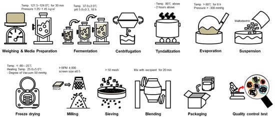 For seed culture, 1% (v/v) of glycerol stock of Bifidobacterium breve IDCC 4401 was suspended and statistically incubated in De Man, Rogosa and Sharpe (MRS) broth at 37 °C in a 40 L fermenter for 18 h. An amount of 10% (v/v) of the seed culture was transferred into a commercial medium (data not shown) and incubated in a 400 L fermenter with 30 rpm for 10 h. The main culture was performed with 2% of preculture under the conditions mentioned for 18 h in a 16 kL fermenter (Figure 1). The biomass and culture media were separated by continuous centrifugation at a constant rate of 8 kL/h and 8000 rpm, yielding 290 kg of B. breve IDCC 4401 with an approx. 52% (w/w) moisture content. Next, the obtained cells were treated at 80 °C for 8 h to collect heat-killed and concentrated cells. The heat-killed cells were mixed with 10% (v/v) maltodextrin of total volume in a 1 kL mixer and freeze-dried at a temperature range of −80–25 °C under less than −300 mmHg. Finally, the heat-killed cells were grilled, finely ground and sieved to obtain <50 μm particles. The particles were then encapsulated and the compositions of the investigational and placebo products are listed in Table S1.