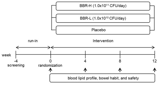 This double-blind, parallel-group, placebo-controlled, randomized trial was conducted between May 2018 and October 2019 at the Seoul National University Hospital, Seoul, Korea. The participants were informed of the purpose, expected effects, unexpected side effect(s) and study method before giving their consent. The hospital recruited the subjects via advertisements (e.g., subway stations), and those who consented to participation and signed a written informed consent form were included in this study. Individuals qualified for randomization met the following criteria: (1) age group ≥ 20 years; (2) LDL-cholesterol group ≥ 100 mg/dL and group ≥ 150 mg/dL; and (3) not using drugs or health-functional foods that influence lipid metabolism within one month before the screening visit. The exclusion criteria were as follows: individuals with (1) cardiovascular, renal or hepatic disease and diabetes (fasting glucose ≥ 180 mg/dL), hypertension, endocrine disorders, autoimmune disease, gastrointestinal disorder or cancer; (2) hypertriglyceridemia (≥500 mg/dL); (3) hypersensitivity associated with probiotics; (4) alcohol abuse, pregnancy or breastfeeding; and (5) participation in other studies within one month. Eligibility criteria were reviewed at −4 weeks. After a 4-week run-in period, individuals following low total fat, saturated fat and cholesterol diets were enrolled before the randomization process.