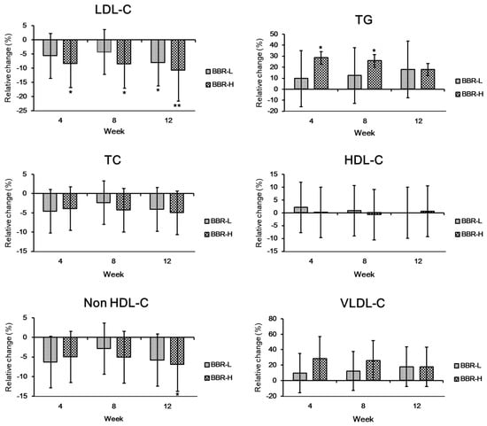 Changes in lipid profile by BBR 4401. Data were expressed as mean ± standard deviation. Significant differences compared to the placebo group are indicated as * (p < 0.05) and ** (p < 0.01). BBR-L, low dose of B. breve IDCC 4401 parabiotics (1.0 × 1010 CFU/day); BBR-H, high dose of B. breve IDCC 4401 parabiotics (1.0 × 1011 CFU/day). Abbreviations: LDC-C, low-density lipoprotein-cholesterol; TG, triglyceride; TC, total cholesterol; HDL-C, high-density lipoprotein-cholesterol; VLDL-C, very-low-density lipoprotein-cholesterol.