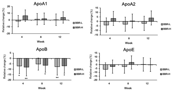 Changes in apolipoprotein profile by BBR 4401. Data were expressed as mean ± standard deviation. Significant differences compared to the placebo group are indicated as * (p < 0.05) and ** (p < 0.01). Abbreviations: Apo, apolipoprotein.