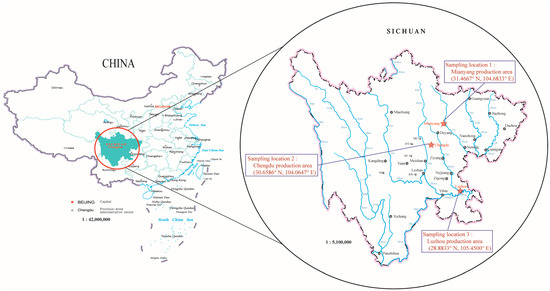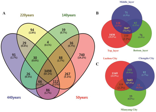 Samples were collected from representative famous traditional FPs for CSAB production [2] in Chengdu City (30.6586° N, 104.0647° E), Luzhou City (28.8833° N, 105.4500° E), and Mianyang City (31.4667° N, 104.6833° E), China. Sample selection was based on the statistical methods described by Carter [30] and the authors’ previous work [2]. Twenty FPs of four different ages were sampled from Luzhou and 10 FPs of the same age were sampled from Chengdu and Mianyang. The FPs in Luzhou were 440, 220, 140, and 50 years old. The FPs in Chengdu and Mianyang were approximately 50 years old. Samples were collected from three depths (top, middle, and bottom) of the FP. The top layer was 0–50 cm from the top of the FP, the bottom layer was 0–50 cm from the bottom of the FP, and the remaining layer was termed the middle layer. Sampling was performed at the end of each fermentation cycle after emptying the fermented cereals. Ten representative pit mud samples (10 g each) were collected from each sampling sites and mixed (total 100 g) to provide a single sample. For each sample, five samples with the same FP characteristics (age, position, and geographical region) were collected as parallel samples. The samples were kept at −80 °C until genomic DNA was extracted. Total genomic DNA was extracted from the pit mud of the FPs using a Power Max® Soil DNA Isolation Kit (MO BIO Laboratories, Inc., Carlsbad, CA, USA). Quality checks and quantification of metagenomic DNA were performed with the Qubit™ 1X dsDNA HS/BR Assay Kit using a Qubit 4 fluorometer (Thermo Fisher Scientific, Inc., Waltham, MA, USA) to obtain a DNA concentration of ≥30 ng/µL and a weight of ≥3 µg. Thereafter, the metagenomic DNA bands were detected using 1% agarose gel electrophoresis yielding clear ≥23 kb bands with no obvious degradation.