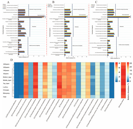 Functional categories of genes in FPs with different ages (A), layers (B), and geographical regions (C); hierarchical clustering analysis heat map of the differential functional categories of genes in FPs (D).