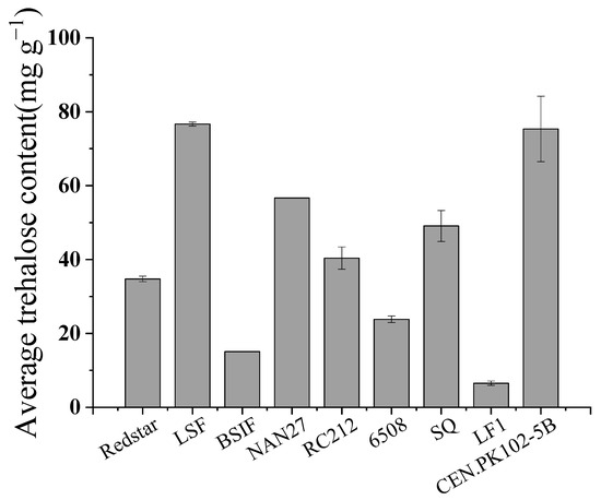 The intracellular trehalose contents of yeast strains are shown in Figure 1. LSF, NAN27, RC212, and SQ have relatively high trehalose content. Moreover, as we speculated, the trehalose content of strain LF1 is much lower than other strains.