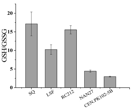 Glutathione content of S. cerevisiae strains (the ratio of cellular GSH to GSSG). The GSH and GSSG Assay Kit (Beyotime S0053, Haimen, China) was used for GSH and GSSG determination. Each experimental group was performed in triplicate.