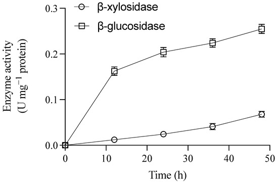 Specific activities of β-glucosidase and β-xylosidase of recombinant S. cerevisiae strain BLN26. Overnight cultures were transferred into fresh YEPD medium with an initial OD600 of 0.2 at 30 °C. Then, the culture broth was withdrawn and centrifuged at regular intervals, and the resulting supernatant was used to determine the enzyme activity. The protein concentration was measured using an Enhanced BCA Protein Assay Kit (Beyotime Biotechnology, Shanghai, China). Each experimental group was performed in triplicate. The symbols: □, β-glucosidase; ○, β-xylosidase.