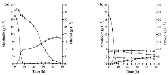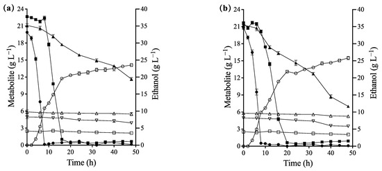 As shown in Figure 8a, when the initial inoculation ratio of LF1: BSGIBX:102SB was 1:1:1 and the total inoculation amount was OD600 = 1, most glucose and xylose were consumed after 16 and 32 h of fermentation, respectively. After 48 h of fermentation, 12.53 and 10.1 g L−1 of xylobiose and cellobiose were consumed, 80.57% and 48.77% of the initial concentration, respectively. When the inoculation ratio of the three yeasts was adjusted to 1:2:2, as shown in Figure 8b, the metabolic rate of glucose and xylose decreased slightly. However, the fermentation performance of xylobiose and cellobiose improved significantly. After 48 h of fermentation, 15.36 and 17.35 g L−1 of xylobiose and cellobiose were metabolized, respectively, 98.23% and 83.51% of the initial concentration.