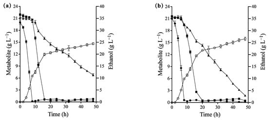 The recombinant strain BLN26 was cultured with an initial cell density of OD600 = 1 in a YP medium with a mixture of glucose–cellobiose (YPGC, ~20 g L−1 glucose, and ~22 g L−1 cellobiose) or glucose–XOS (YPGO, ~20 g L−1 glucose and ~20 g L−1 XOS) as the carbon source. As shown in Figure 4, BLN26 can consume all the glucose in about 8 h. Almost all the cellobiose was fermented to ethanol in 48 h; the ethanol yield was 0.442 g g−1 based on the consumed sugar (glucose and cellobiose), as shown in Figure 4a. These results indicated that the engineered strain BLN26 maintained its excellent glucose metabolism ability and was endowed with better cellobiose fermentation ability. In fermentation with YPGO, as shown in Figure 4b, the initial concentrations of xylobiose, xylotriose, and xylotetraose are approximately 5.84 g L−1, 4.91 g L−1, and 2.58 g L−1. Under the catalysis of β-xylosidase secreted by BLN26, a small amount of XOS was degraded, corresponding to about 0.61 g L−1 of xylobiose, 1.20 g L−1 of xylotriose and 0.51 g L−1 of xylotetraose. Since the natural S. cerevisiae RC212 and its successor BLN26 could not metabolize xylose, the above-mentioned degraded XOS eventually led to about 3 g L−1 xylose accumulation in the culture medium.