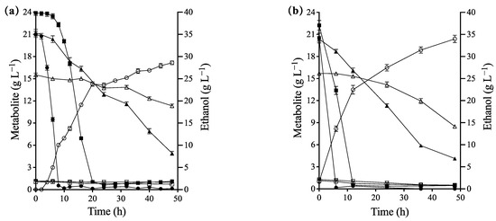 It is still challenging to achieve effective co-utilization of mixed sugars in LB hydrolysate, and carbon catabolite repression (CCR) is considered a bottleneck problem in the field of lignocellulosic biorefineries [75]. By constructing parallel utilization pathways of pentose and hexose in different microorganisms of consortia, the coculture systems can simultaneously utilize LB-derived mixed sugars based on a dedicated metabolic pathway. Both E. coli and S. cerevisiae have been engineered to be this kind of ‘specialist’ strain [26,78,79,80]. However, the S. cerevisiae strains used in this work were not ‘specialist’ strains, glucose metabolism was preserved in all the strains. For example, LF1 and BSGIBX can utilize glucose and xylose efficiently and synchronously for their multiple modifications in xylose metabolism [16,21], and this largely alleviated the severe inhibition of xylose metabolism by glucose. As shown in Figure 9, all four LB-derived sugars were consumed in 24 h by our ternary consortium. To the best of our knowledge, this is the first work aiming at co-fermenting four LB-derived sugars by synthetic S. cerevisiae consortia.