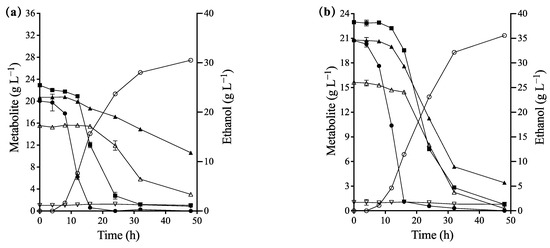 Although the strain BLN26 could consume all the cellobiose and produce corresponding ethanol within 48 h when fermented alone (Figure 4a), cellobiose cannot be completely decomposed within 48 h when xylose is present in the culture medium (Figure 5), especially when XOS is present (Figure 6). Even if XOS was pretreated using enzymatic hydrolysis (Figure 7a) and the initial inoculation amount of the binary consortium (composed of LF1 and BLN26) is increased (Figure 7b), cellobiose cannot be completely metabolized. In addition, the fermentation of xylobiose also has similar problems, and its metabolic performance is even worse than that of cellobiose. We speculate that the possible reason is that BLN26 expresses and secretes β-glucosidase and β-xylosidase simultaneously, resulting in its metabolic burden. Therefore, to achieve the co-fermentation of four sugars in LB hydrolysate, we consider choosing two other engineering strains of S. cerevisiae.