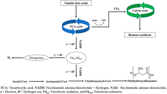 Like other microorganisms, the production of PHAs using PNSB is one of the many ways to dispose of excess reducing equivalents and reach redox equilibrium. They absorb light energy (photons) through their photosystem and store it as chemical energy (Adenosine triphosphate-ATP), which is required for cell growth and cell function. Volatile fatty acids are among the most easily assimilated substrates by PNSB and are oxidized into H+, CO2, and electrons through the tricarboxylic acid cycle (TCA). When biomass production is not possible (through CO2 fixation via the Calvin cycle), these bacteria dissipate excess electrons via PHA and hydrogen production, as presented in Figure 2 [12]. This is frequently associated with nutrient limitation, in particular nitrogen limitation—as is common for many organisms that produce PHA. However, PNSBs are also capable of producing PHA under concomitant growth, particularly with excess irradiation, such that the electron generation exceeds the ability to simultaneously build biomass [35].