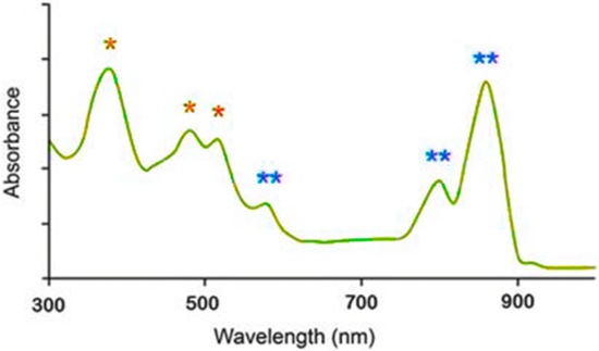 Typical absorption spectrum of PNSB. * shows absorption peaks of Crts, while ** represents absorption peaks of BChls. Reproduced from Adessi and De Philippis [62] with permission.