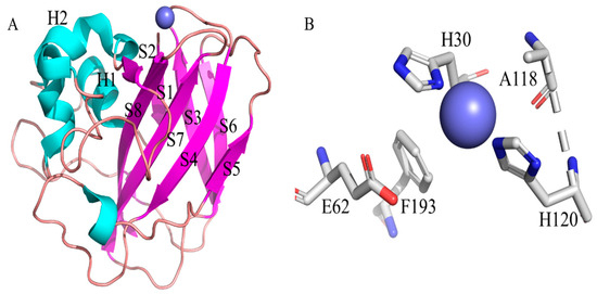 X-ray crystal structure diagram of SliLPMO10E. (A) The β-sheet fold in the figure is purple, the loop 2 region is cyan, the disulfide bond is pink, and the copper atom is spherical. (B) The rod-like structure represents an active center, the coordinated His residue is silver, and the deep blue ball is the copper atom.