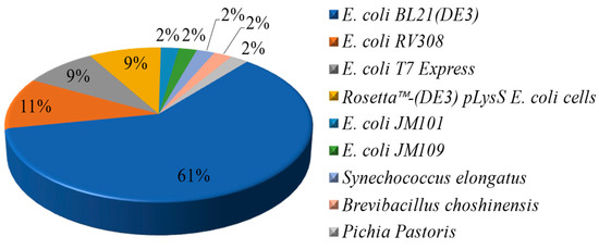 The majority of AA10 family LPMOs are derived from bacteria and are typically expressed in E. coli as a heterologous host. Among the 45 characterized LPMOs, the expression systems were summarized, and it was found that E. coli BL21(DE3) was the most commonly used strain, accounting for 19 LPMOs. Other frequently used strains included -Rosetta™-(DE3) pLysS E. coli, E. coli T7 Express, and E. coli RV308, with 4, 8, and 7 LPMOs, respectively. There were also a few LPMOs expressed in E. coli JM101 and E. coli JM109 (Figure 2). Commonly used expression vectors included pRSET, pJB, and pET (Table 1). The E. coli BL21(DE3) carries the T7 RNA polymerase gene controlled by the lacUV5 promoter on its chromosome. Therefore, upon induction with isopropyl β-D-1-thiogalactopyranoside (IPTG), the T7 promoter-driven exogenous genes can be efficiently expressed. Although the T7 promoter is tightly repressed, expression of T7 RNA polymerase and the target protein begins before IPTG induction, allowing background expression of LPMOs to be observed, even in the absence of IPTG induction [14,50].