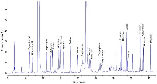 The mobile phase was prepared from 20 mM sodium acetate. The pH of the mobile phase was pH adjusted to 6.5 with 0.8 M acetic acid. An injection volume of 3 µL was used. Derivatized amino acids and biogenic amines were detected at 246 nm. The gradient profile is described in Table S3 (in Supplementary Materials).