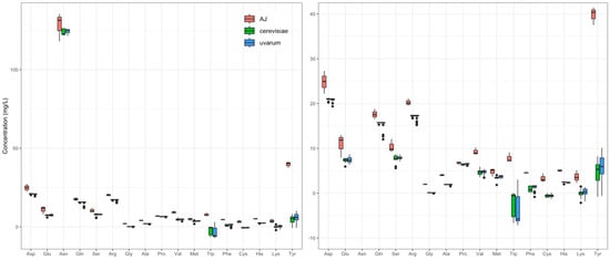 Boxplots showing the utilization pattern for AAs of 6 S. cerevisiae (cerevisiae, green box) and 14 S. uvarum strains (uvarum, blue box), compared to the initial concentration in apple juice (AJ, red box). On the left side, a pattern for all amino acids is shown, while on the right side, an enlarged plot for lower concentrations is presented. Asp-aspartic acid, Glu-glutamic acid, Asn-asparagine, Gln-glutamine, Ser-serine, Arg-arginine, Gly-glycine, Ala-Alanine, Pro-proline, Val-valine, Met-methionine, Trp-tryptophane, Phe-phenylalanine, Cys-cysteine, His-histidine, Lys-lysine, Tyr-tyrosine.