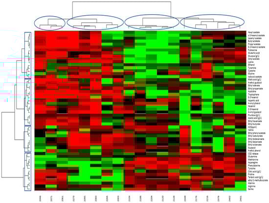 Based on the observed color scales, it can also be said that the fourth yeast group (i.e., the fourth group at the top from the left), consisting of one S. cerevisiae strain (2349) and five S. uvarum strains (2176, 2216, 2376, 2402, and 2401), has the highest content of the second class of variables (relatively high contents of malic acid and the other amino acids histidine and tryptophan, high contents of volatile phenols 4-vinylphenol, 4-vinylguaiacol and 4-ethylguaiacol, relatively high contents of all three C6 alcohols and ethyl esters ethyl valerate, ethyl propanoate, ethyl hexanoate, and ethyl butyrate).