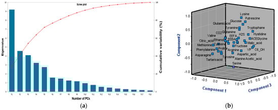 The scree plot (a) and the component 3D plot in rotated space (b) allied with the PCA. The scree plot orders the eigenvalues from largest to smallest.