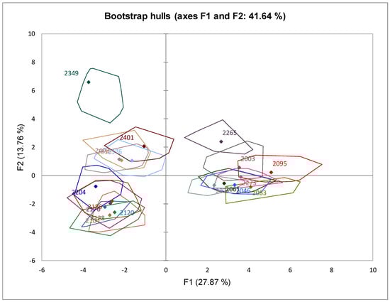 Bootstrap hulls involve generating a series of bootstrap samples from the original dataset and then computing the PCs for each bootstrap sample. We use them to assess the significance of individual observations/yeasts in our dataset and to see the possible clusters in our 19 fermented yeast strains (in the first two PCs). Yeast strains that consistently fall within the convex hull of the scores for each bootstrap sample are considered statistically significant, while yeast strains that consistently fall outside the convex hull are considered statistically non-significant. By using bootstrap hulls in PCA, we identified influential observations (i.e., the yeast strains) in the dataset that could affect the results of the analysis. The results of the analysis can be interpreted based on the location of the observations relative to the bootstrap hulls. Observations that consistently fall outside the convex hull may be outliers or noise in the data. By identifying influential observations, it is possible to determine if they are outliers that need to be removed from the analysis or if they represent important patterns in the data that should be investigated further. However, as can be seen in Figure 5, our observations consistently fall within the designated convex envelope. Therefore, they should all be considered statistically important and reliable; this is because we have already identified and removed the outliers from our data set.