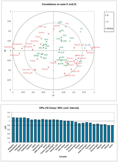 Thus, the goal was to find out the relationship between two blocks, the Y-block and the X-block (i.e., the set of response variables and the predictor variables of interest). PLS regression was used to identify (1) the underlying factors responsible for the variation in the data; (2) the contributions of 28 traits/predictors, including amino acids, sugars, ethanol, acids, etc. (i.e., the variables forming the X-block) and to correlate and discover the five groups of cider aroma attributes (i.e., the variables forming the five groups in the Y-block) from 19 yeast strains used for fermentation (Table 3).