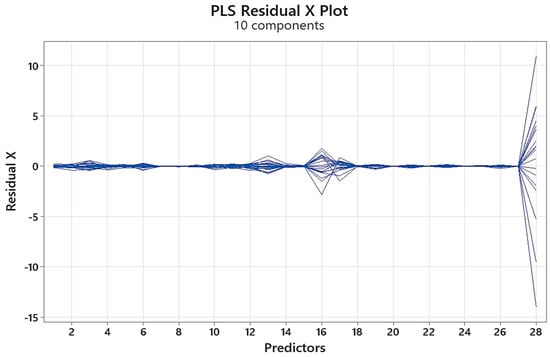 Finally, we proceeded with error analysis of our PLS model using the x-residual matrix plot. To this aim, we examined general patterns in the residuals and identified areas where problems exist. We then examined the x-residuals displayed in the output to determine which observations and predictors the model may be poorly describing. As can be seen in Figure 7, the PLS residual X-plot shows that the residuals are close to zero, indicating that our model does a good job of describing most of the variance in the predictors in our experimental analysis with cider made with 19 Saccharomyces strains. There is no specific line on the graph that deviates dramatically from the other lines; therefore, the model describes all observations/yeast strains (represented by lines) very well. At both points 16 and 28, which correspond to the two predictors lysine and H2S, respectively, the lines are far apart. At point 16, the lines are slightly apart at the same point on the x-axis. Therefore, the model can still be considered a good statistical tool to describe the predictor at this point (i.e., lysine). However, at point 28, most of the lines diverge at the same point on the x-axis, and this means that the model can poorly describe the corresponding predictor at this point (i.e., H2S). This could be related to the values obtained for H2S, a sparse vector where 63% of the elements had a value of zero.