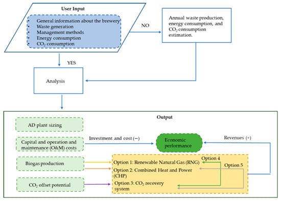 Several spreadsheet tools have been developed to aid in the economic and environmental assessment of AD systems. However, most of these tools focus on livestock manure as the primary AD substrate. For example, the US Environmental Protection Agency (US EPA) has developed a Co-Digestion Economic Analysis Tool (CoEAT) to evaluate the economic feasibility of AD co-digestion of manure with food waste, fats, oils, and grease []. Astill and colleagues developed a tool to aid farmers in AD adoption decision-making. The tool is designed to assess the economic feasibility of AD using farm-derived feedstocks, including manure and crop residues []. Therefore, the existing tools are not directly applicable to craft brewery waste. Furthermore, no prior study examines the economic tradeoffs of CO2 recovery systems for small craft breweries.
