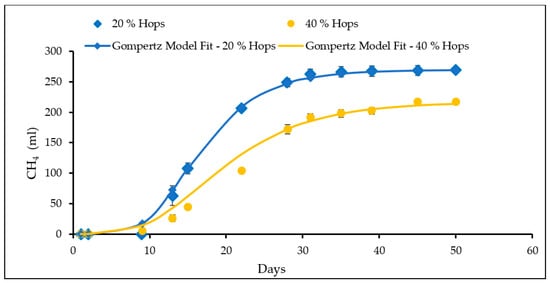 Due to the short operating time of the ASBR studies (25 days), steady-state operations were not established, which is a limitation of this study. In a prior study, Blaxland et al. [] observed acclimation of the microbial community against inhibitory hop substances over time. Therefore, longer studies should be carried out to determine whether acclimation of microbial communities to hops might result in increased methane yields.