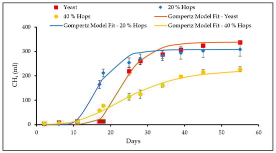 Cumulative methane volumes and Modified Gompertz model fit for Phase II (error bars show standard deviations between duplicate BMPs).