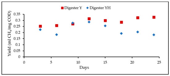 Bench-scale ASBRs were set up with yeast waste alone and with 20% hops (based on COD) and operated at an OLR of 720 mg COD/L/day, an HRT of 20 days, and an SRT of 190 days. Biogas and methane yields in the yeast-only ASBR were similar to results from the preliminary 2-month study performed with duplicate ASBRs operated with yeast waste alone []. In both ASBRs, methane yields (Figure 4) were comparable to those reported for co-digestion of spent yeast with brewery wastewater, which ranges 0.20–0.35 mL CH4/mg COD [,,,].