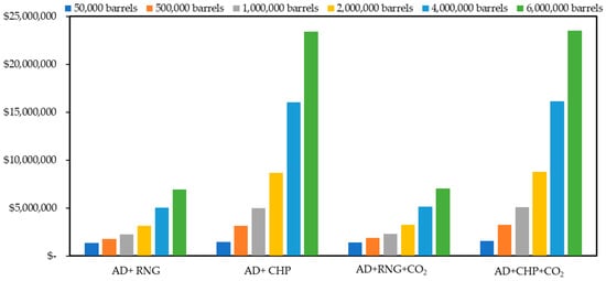 This study examined potential biogas production for craft breweries, considering various annual production levels: 50,000, 500,000, 1 million, 2 million, 4 million, and 6 million barrels, based on typical production rates for U.S. craft breweries []. AD capital costs, with additional investments required for RNG or CHP with and without CO2 recovery, are shown in Figure 5. AD capital costs included tanks, mixers, inlet and outlet pumps, and piping (listed in Table S2). Small-scale systems that can recover CO2 from beer fermentation gases are generally affordable, with a current capital cost of approximately USD 150,000 [].